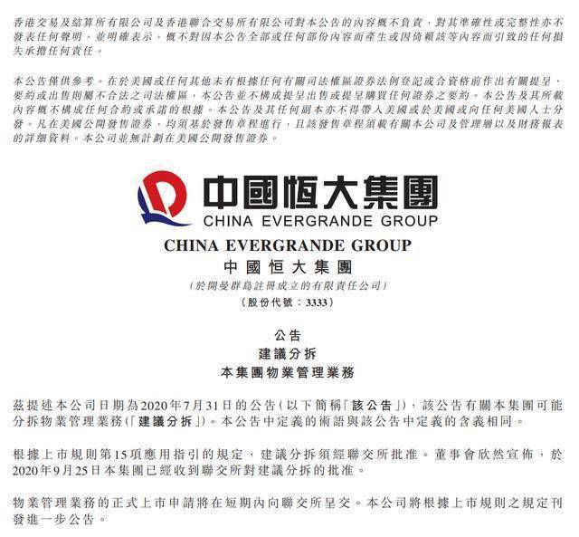 7月31日,中国恒大(03333.HK)公告,公司正在考虑可能分拆物业管理服务及相关增值服务业务在香港联合交易所独立上市。